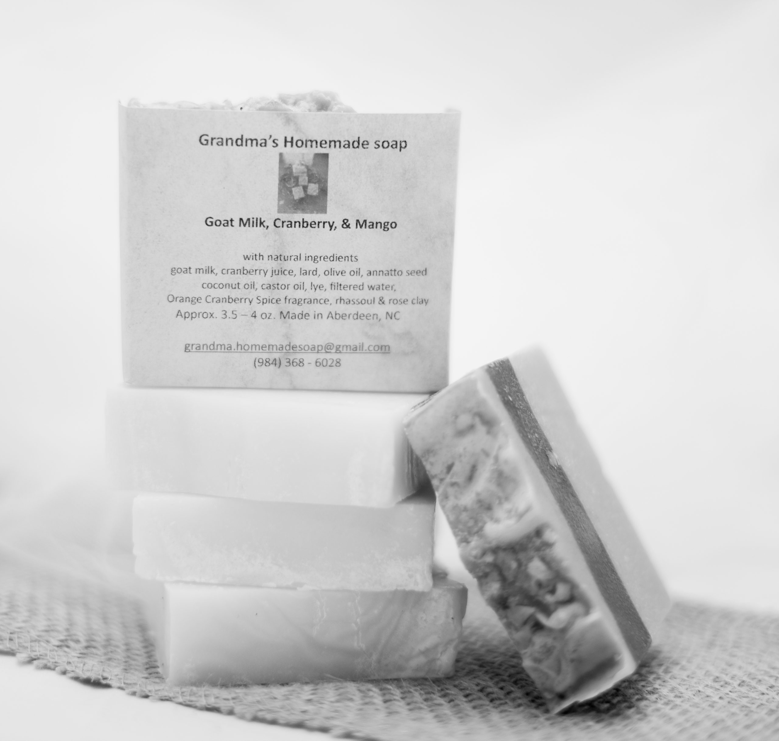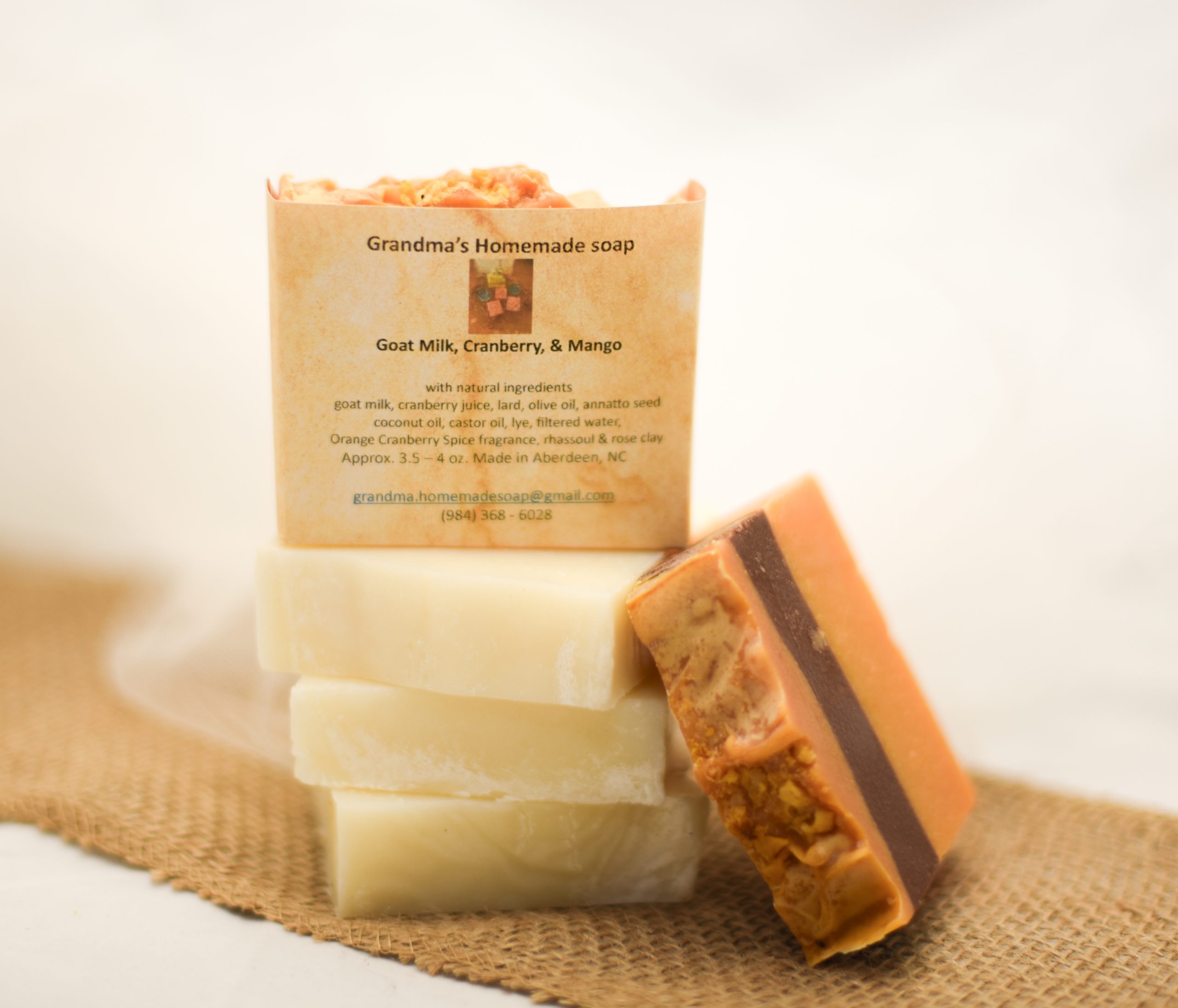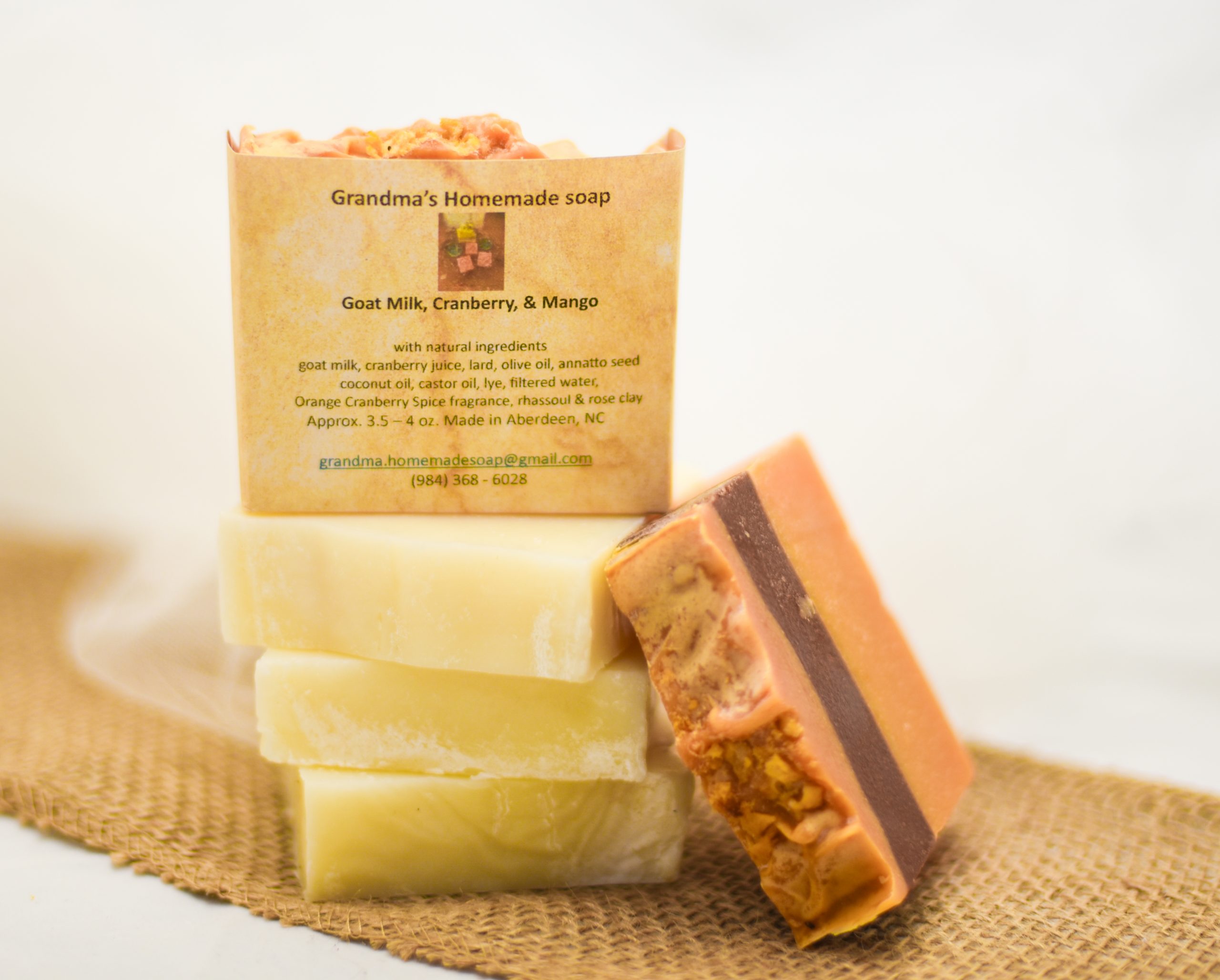 | Ingredients | 100% pure cranberry juice, annatto seed-infused olive oil, castor oil, coconut oil, filtered water, goat milk, lard, lye, olive oil, orange essential oil, rhassoul clay, rose clay |