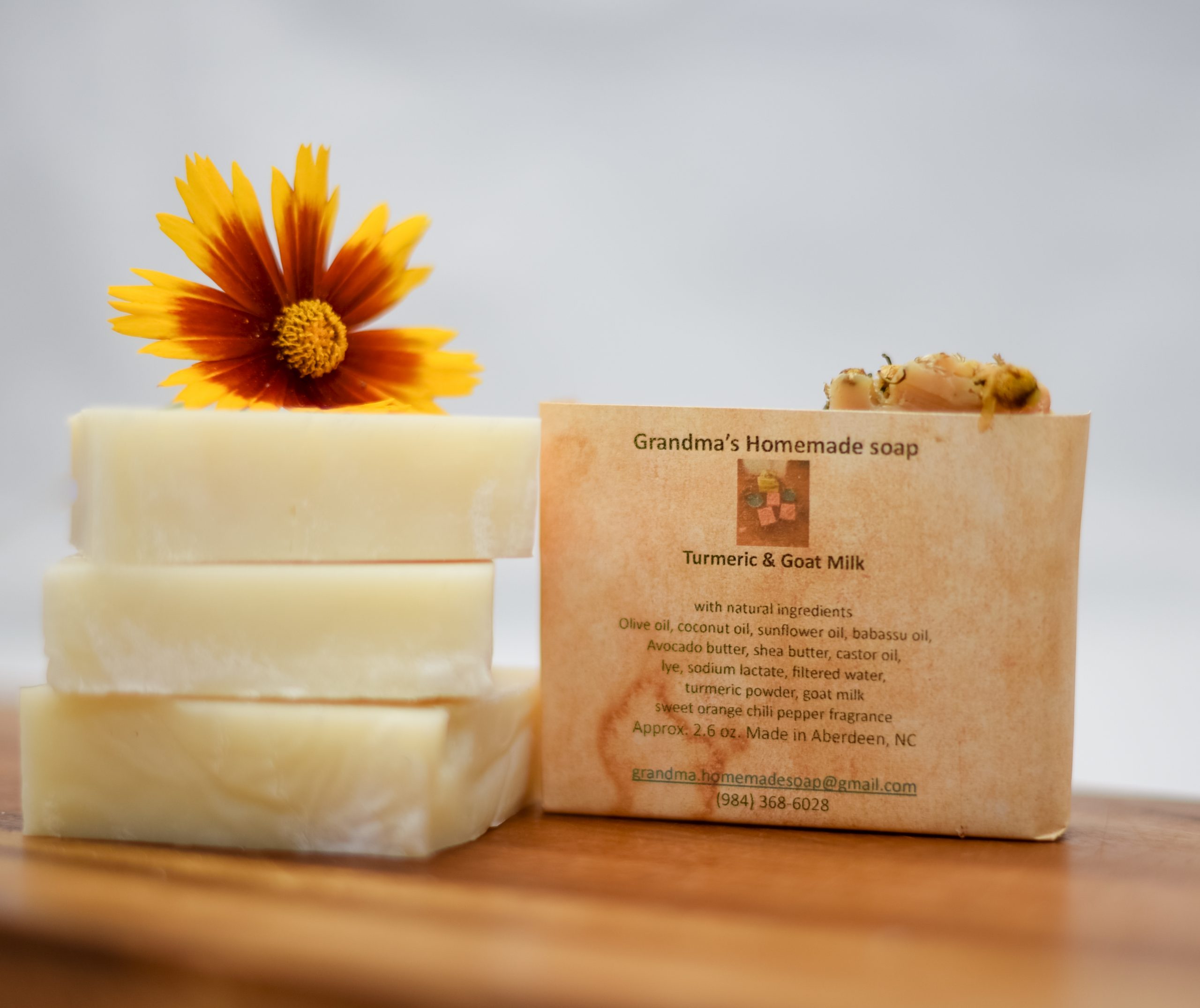 | Ingredients | Avocado butter, babassu oil, castor oil, chamolile buds, coconut oil, filtered water, goat milk, lye, olive oil, orange essential oil, shea butter, sodium lactate, sunflower seed oil, turmeric powder |